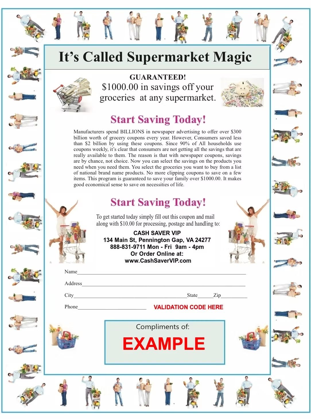 This program is designed to save you money on your grocery bill every time you shop. For example, if you and your neighbor shopped for the same items on the same days at the same supermarket, over a one-year period you will spend $1000 less than your neighbor by using this offer.